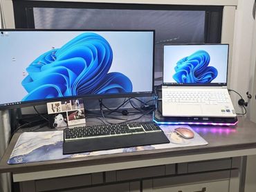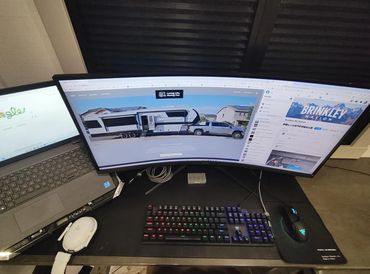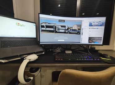 A big "AH HA" moment for the RV office came when I discovered the curved 34" gaming display. With the 34" curved monitor we are able to maximize space - both on the desk and on the screen with the monitor able to be a single massive screen, or 2 split screens running 2 50% windows or 66%/33%. The laptop monitor completes a true 3 monitor layout we have at home while absolutely minimizing the equipment footprint.