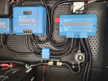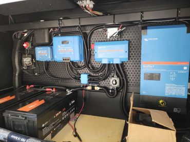 How do you manage power input from 12V DC, 110V AC, 4 solar panels, generator, shore power and sending that to the rig, keeping 12V systems on a 12V current, 110V systems on 110V, unless you need to invert 110V applications to run only off a 12V source, while keeping the batteries charged by converting 110V to 12V current? Well, if you're smart - you don't manage that - Victron manages it.