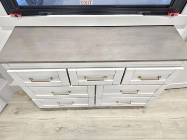 The bedroom wardrobe in most Brinkley RVs was designed with a sliding top and a drop in desk insert. This option allows the bedroom to convert easily to Tinas office. Upstairs, with a door to block noise, and dedicated AC, she has a perfect office space that remains completely out of the way during non-work hours.